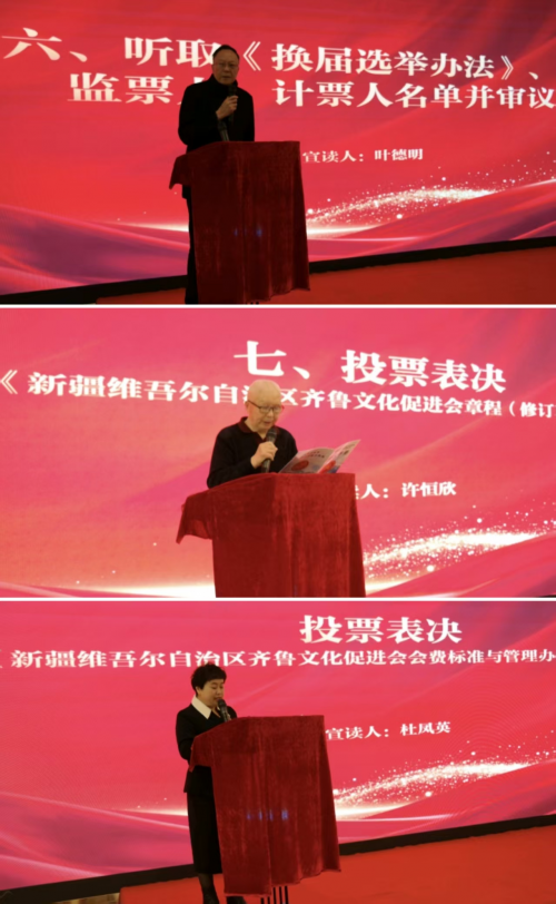 大会上,全体会员以无记名投票方式,表决通过《新疆维吾尔自治区齐鲁文化促进会章程(修订草案)》和《新疆维吾尔自治区齐鲁文化促进会会费标准与管理办法(草案)》,并选举产生新一届理事、监事。