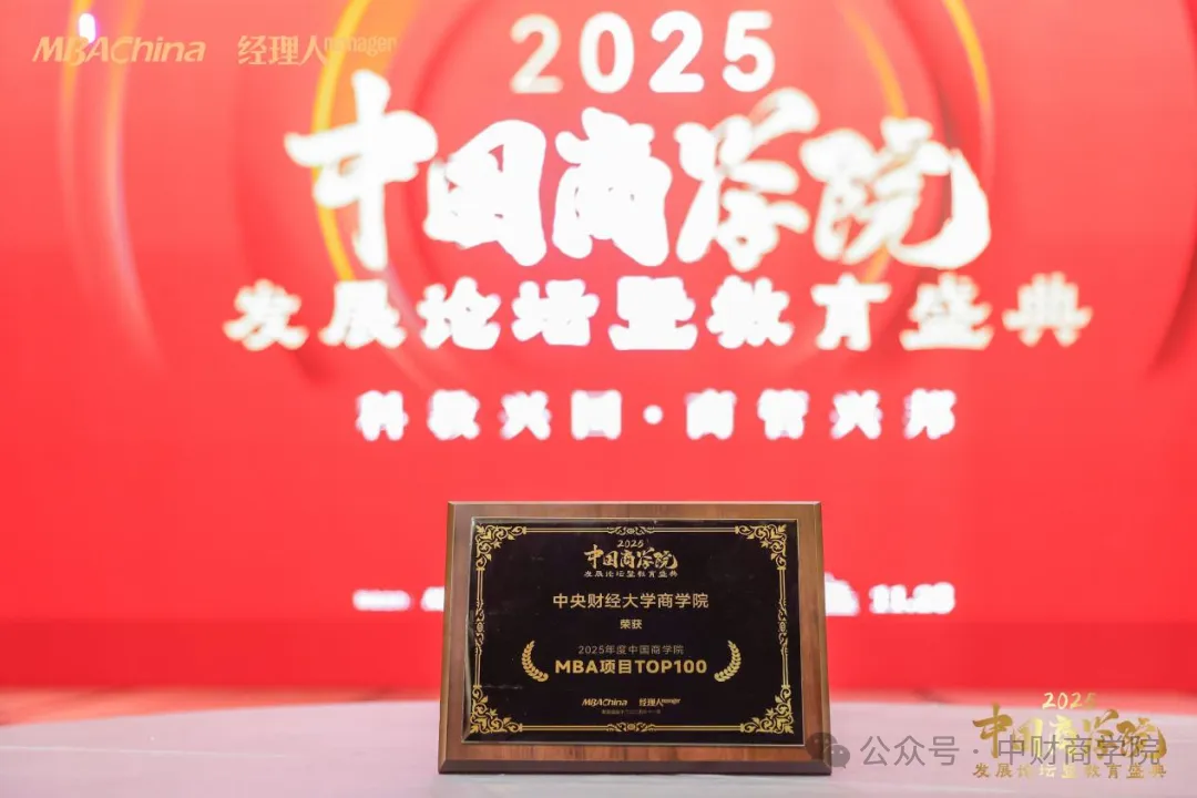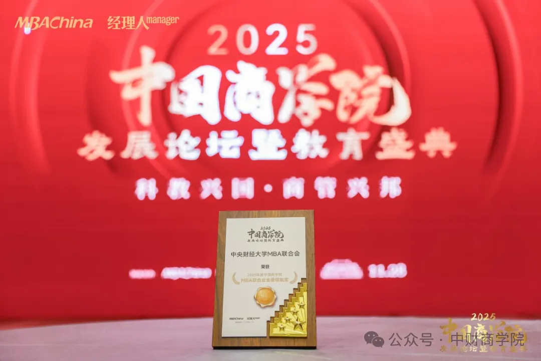中央财经大学MBA联合会荣获“2025年度中国商学院MBA联合会金徽领航奖”。该奖项旨在表彰在组织力、凝聚力和创新力方面表现突出的MBA联合会。