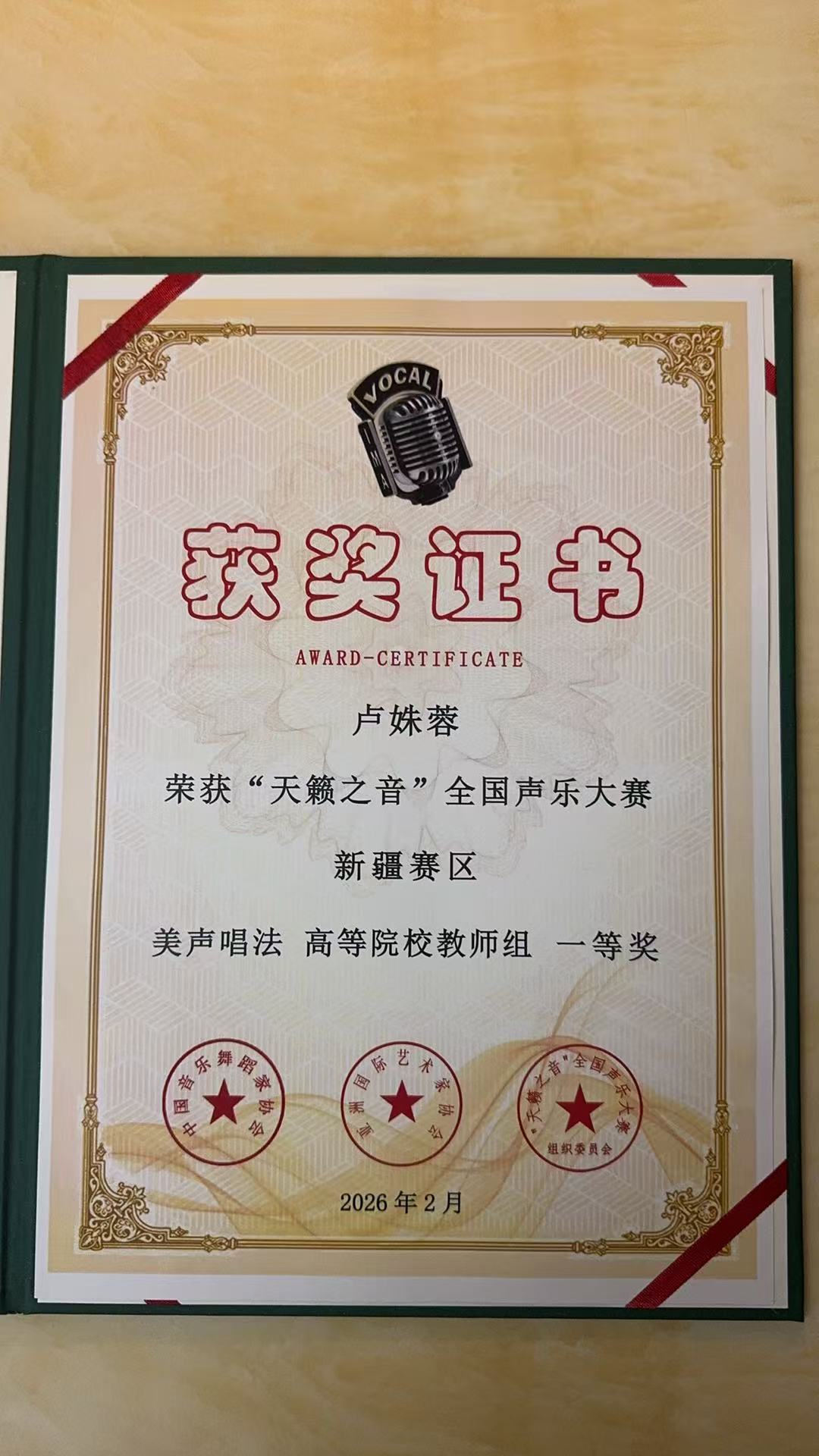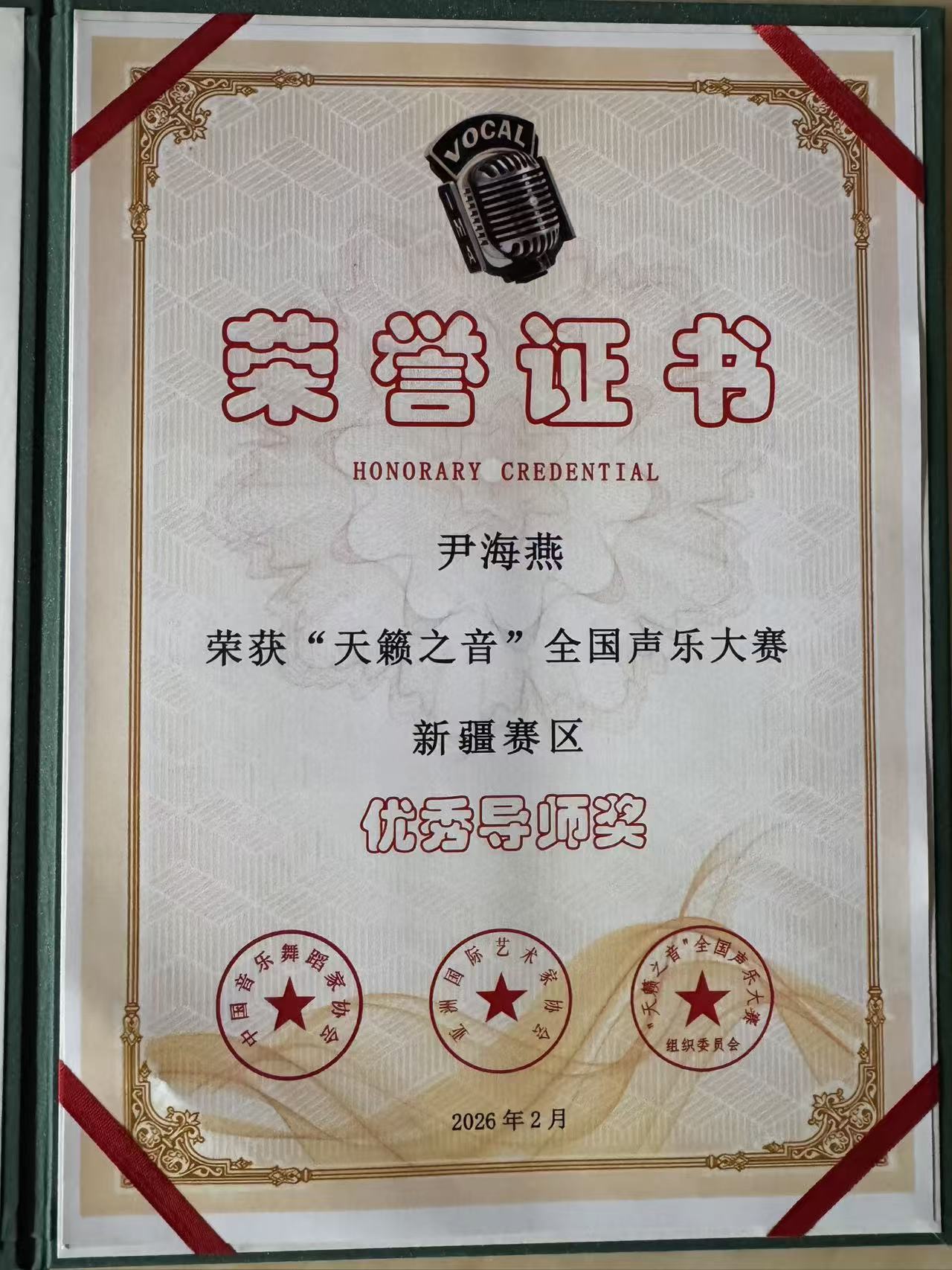 【世界华人周刊·新疆聚焦】近日,在“天籁之音”全国声乐大赛新疆赛区的舞台上,花腔女高音歌唱家、新疆艺术剧院民族乐团特聘荣誉歌唱家尹海燕凭借精湛的教学实力与深厚的艺术底蕴,荣获优秀导师奖,其悉心指导的学生卢姝蓉更是在美声唱法高等院校教师组中脱颖而出,斩获一等奖,用实力诠释了“师者匠心,桃李芬芳”的深刻内涵。